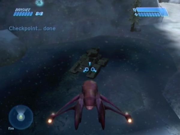 Return to the Banshee. At this point you can continue the checkpoint delay either with a grenade or using Banshee fire. Get the checkpoint near the tank, so you'll be able to try out adjustments conveniently. Preferably also save the checkpoint, in case you ever inadvertently get the 'upfield checkpoint' (see later warning).