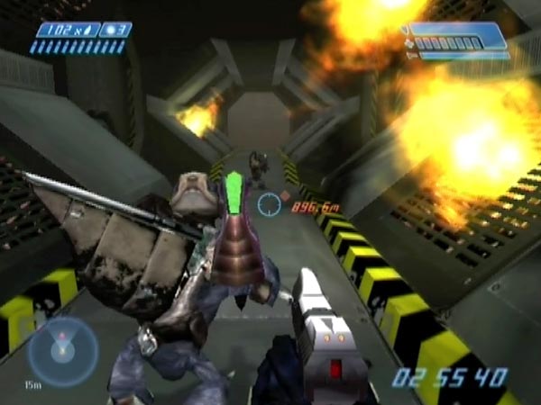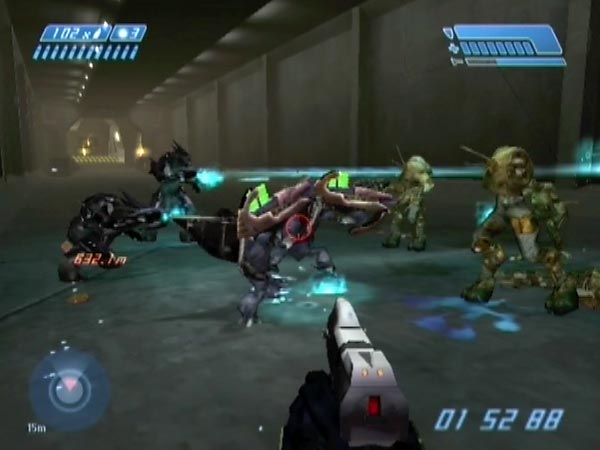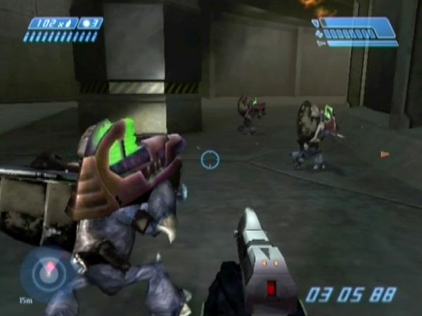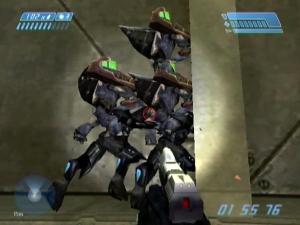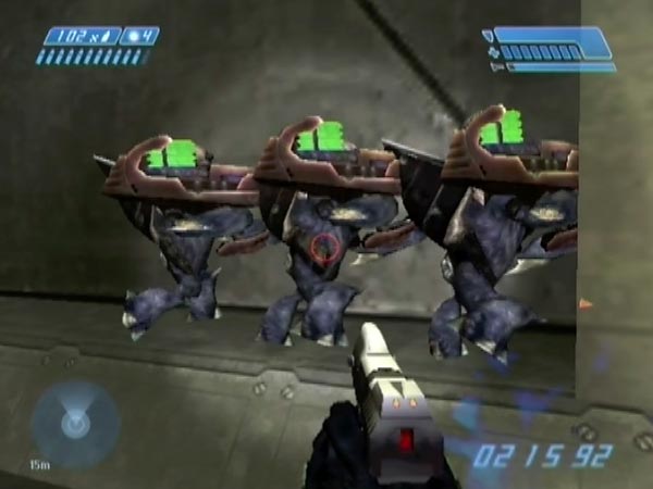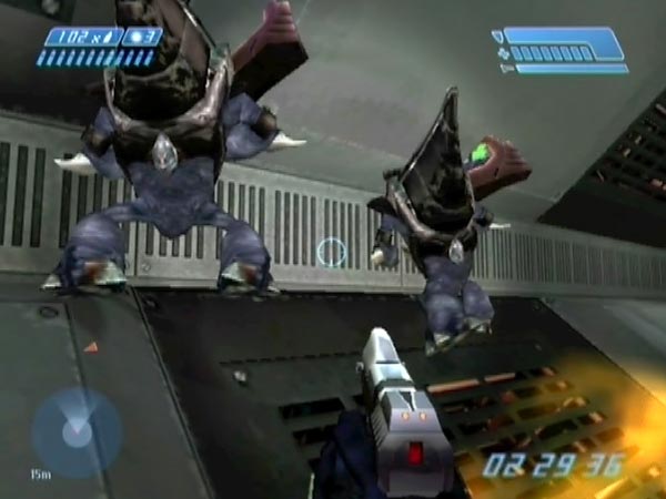 Not long after passing the Pelican rendezvous area and (hopefully) getting a checkpoint, you encounter a Covenant special ops squad making a run for it along the winding corridor. Normally the squad would comprise two Elites with plasma rifles plus three Grunts with fuel rod cannons. But if the game is overloaded - which is one possible route to snatching a Banshee - some of the squad may fail to spawn, and it's also possible for one or more covies to be weaponless.