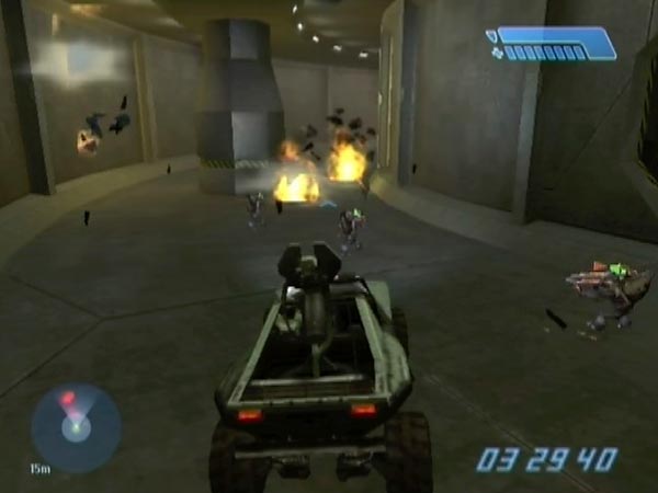 This bit of fun is just for a Warthog. As long as you don't dawdle, you'll typically find that when you arrive at the special ops squad, the Grunts are heading across the passage to go around a pillar, presumably to avoid the two fires which are burning on or near a ramp. If you head for that ramp and splatter a Grunt on the way, or even two if the opportunity is there, one or more plasma grenades may go into a fire (typically the nearer one) and detonate, giving the hog a spectacular boost as you take the ramp.