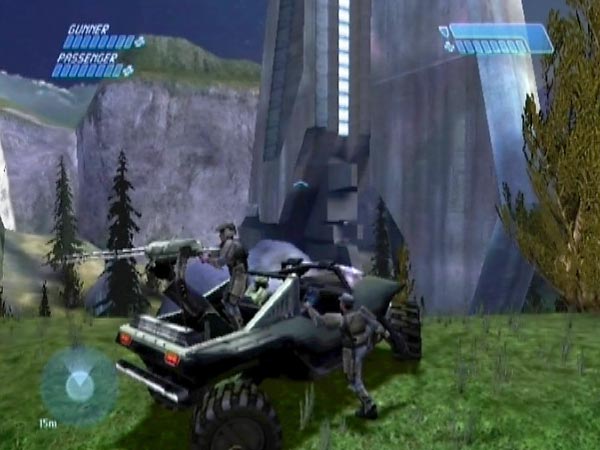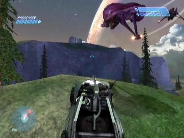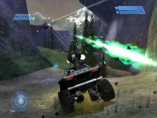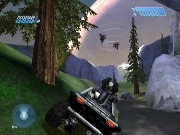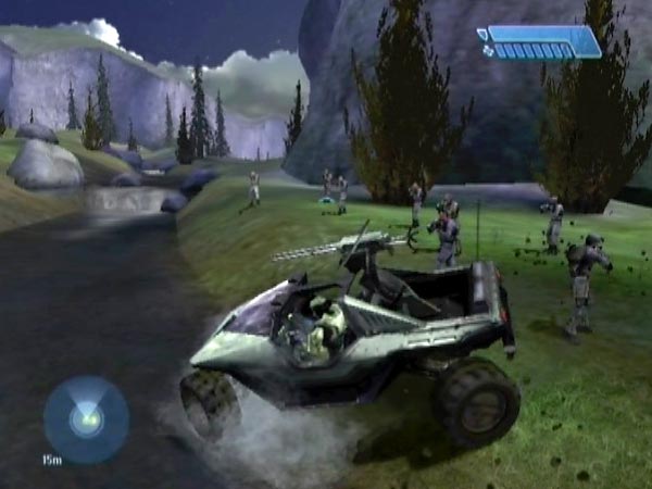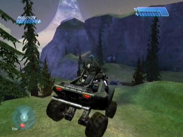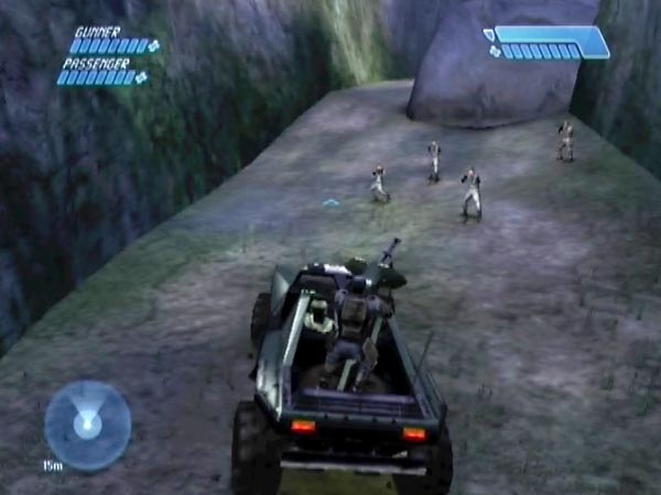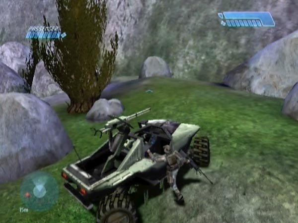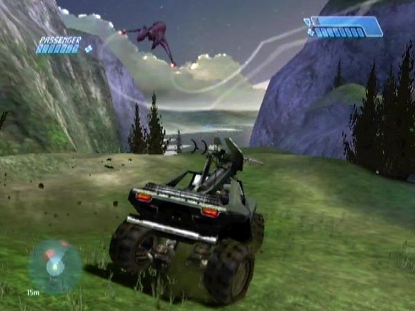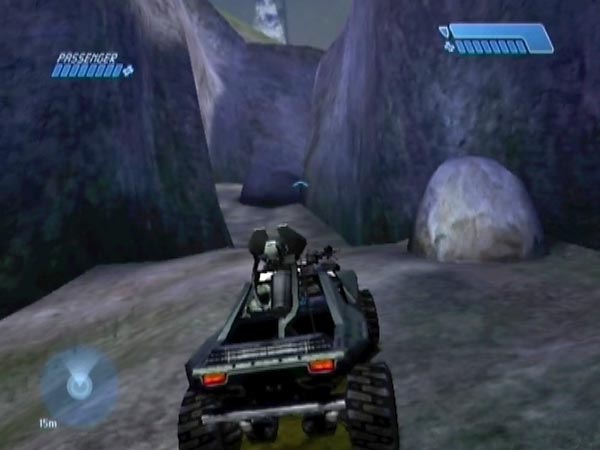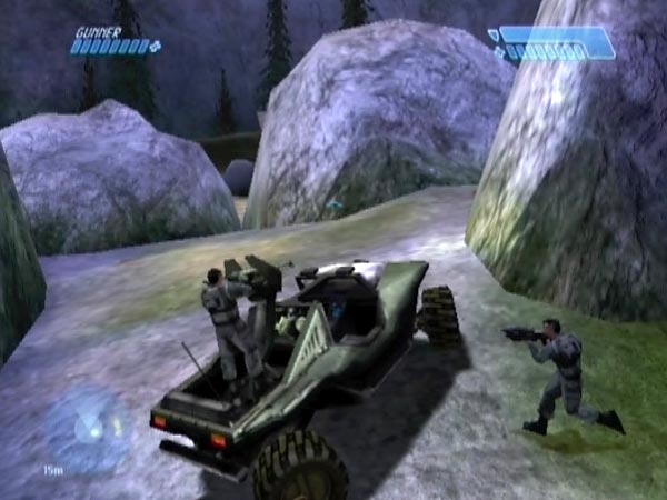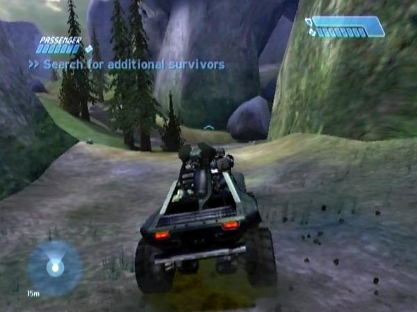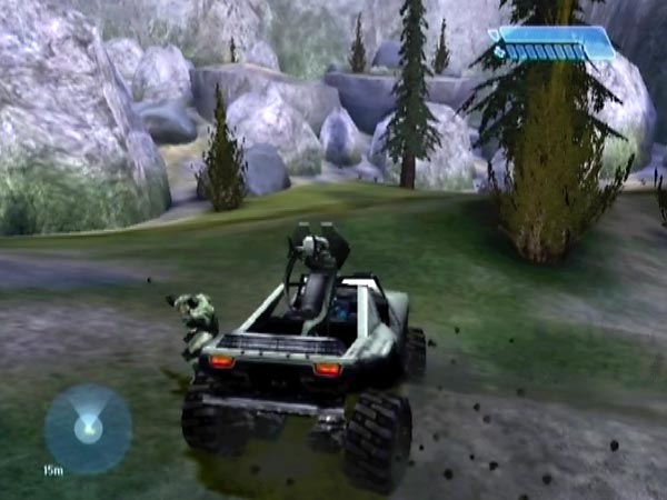 Driving into battle can be great fun with all the weaving and jumping you can do in this lush rolling terrain. In fact I probably enjoy it as much as the actual battling! It's good to have a passenger because of the things he'll say, plus he's liable to do a bit of shooting. The rockslide exit is a great starting point for heading places, and you can always get things off to a flying start with a jump off the big mound nearby - a great feature. Have fun exploring different routes. There's a lot of potential for skilful controlled driving, threading the hog through narrow gaps or even just keeping the thing upright. I get a kick out of trying all sorts of variations and making things nice and smooth. You don't even need to take a 'direct' route, as long as the Banshees aren't going to spot your squad before you lead them there. So why not take the long way around?