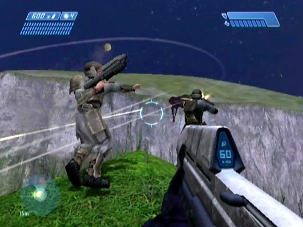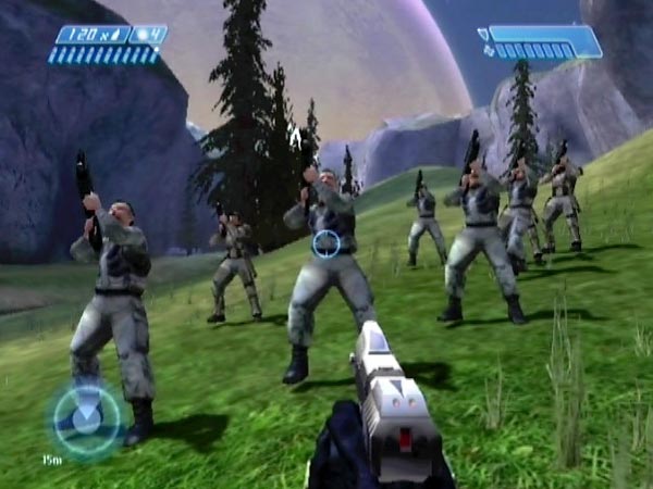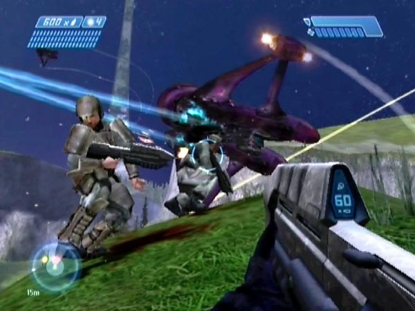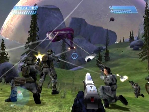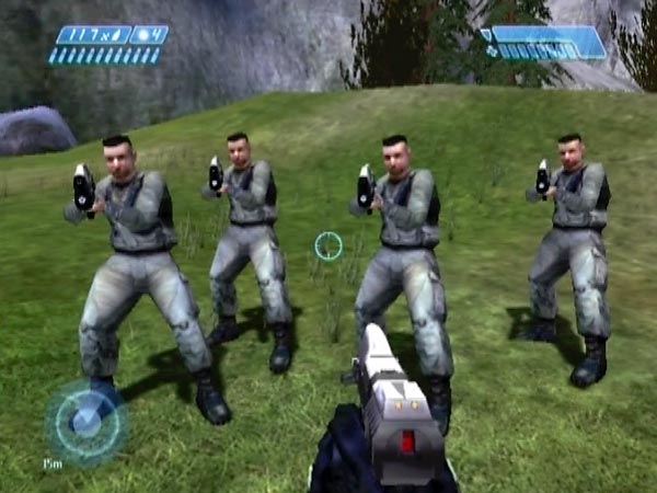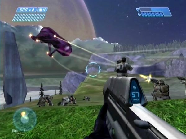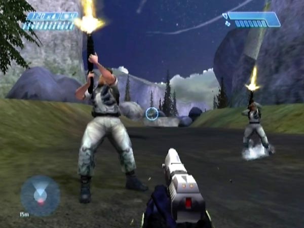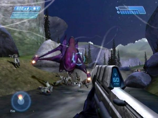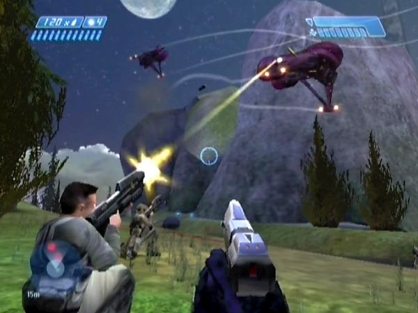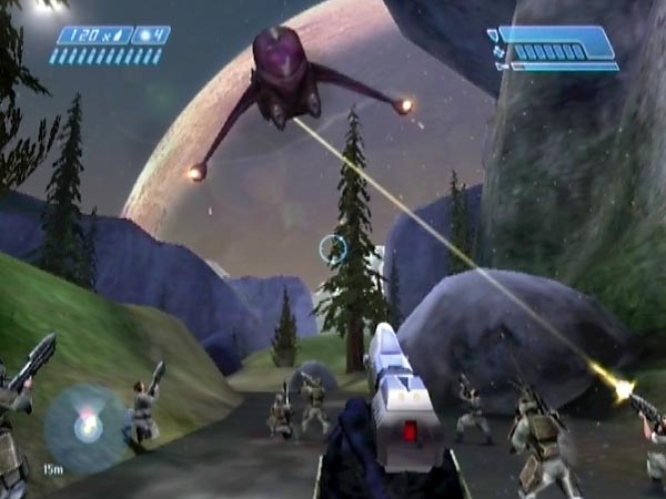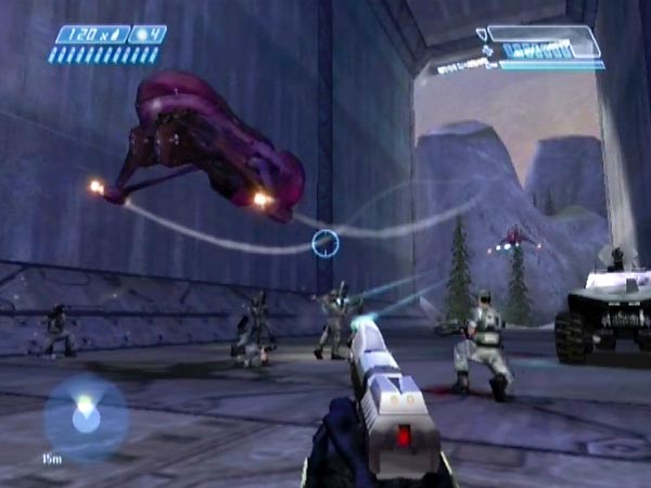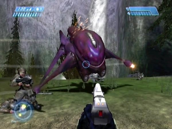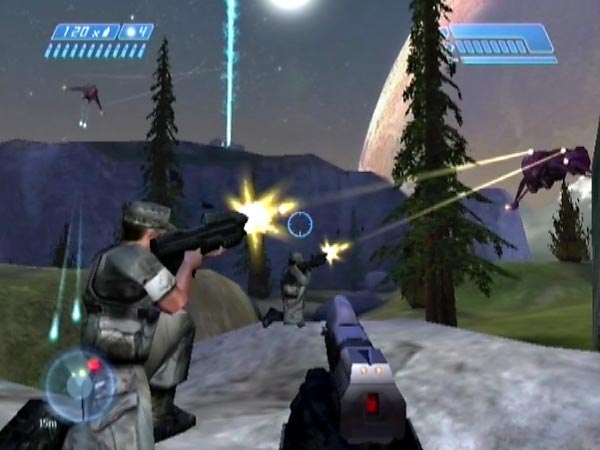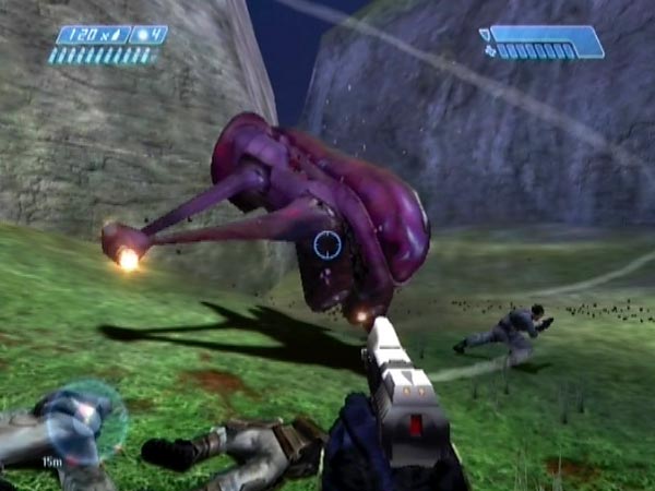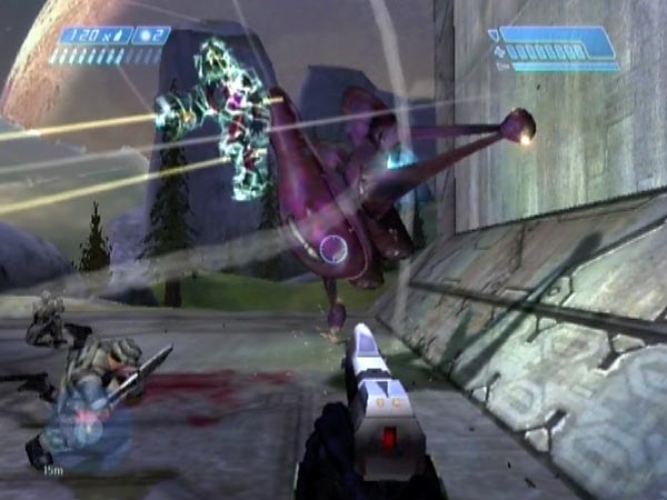 There's further drama when the Banshees come swooping along at about the same level as the top of the mound, occasionally even coming right over it with the apparent intention of taking your head off. As they veer away, their undersides are nicely exposed for some concentrated AR drilling. There are great tagging opportunities too. The pilots seem quite keen on blasting Marines and cyborgs off the mound with plasma bolts, and sometimes laugh as they swoop off.