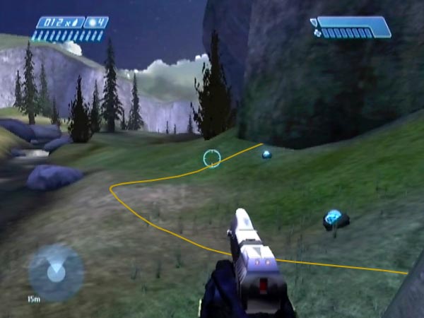 The big rock at the back is sometimes climbable, giving you a nice wide perch if you want one. You can even drive a Warthog up to drop Marines on top of it; I've had four up there. The smaller rocks can be high enough to give you decent cover from Banshee fire, which is likewise a good thing to have. As you may know, rock geometry varies. It gets decided at the loading point shortly before you emerge from the tunnel. If you save at the preceding checkpoint (just after the light-bridge), you can make repeated attempts at getting good rocks as follows, when creating your base save. Take a look at the rocks when you emerge. If they aren't to your satisfaction, eject the disc and reload to try again. Alternatively, you can always re-randomize the rocks any time later by going back across the loading point then returning.