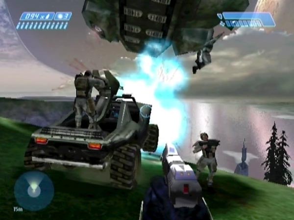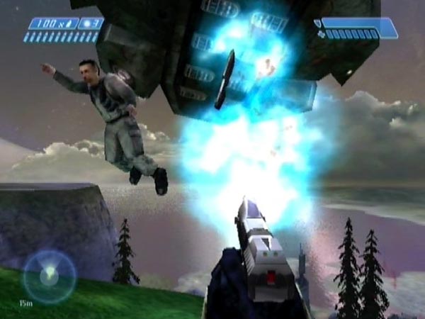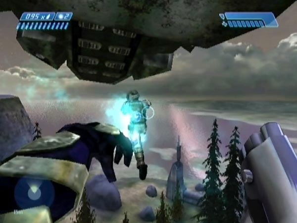 From up on the hilltop overlooking the cliffside survivor area, you can have some fun with occupants of the evac Pelican. An activity I call 'evac tagging'. To set this up, ideally you want a checkpoint a few seconds before the Pelican is due to accelerate into its departure path, which takes it low over the hill. That's easy to engineer, by suitably delaying the checkpoint which is due shortly after the Pelican touches down to pick up the survivors. You could potentially use a Warthog catapulting set-up, as I did for some of the clips in BCM411 (from when I first tried out the idea), or create a set-up specifically.