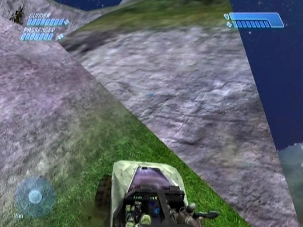 One other descent area to explore is a partly grassy area at the bottom of the valley. It's not cliff face and it's not as extensive as the areas already mentioned, but you can still have some fun there, and I found a surface on which the hog was actually able to hold station (as long as all four wheels had traction) and even slowly drive upwards. Incidentally, you can see around the side of the map in that area, especially if you drive off appropriately.