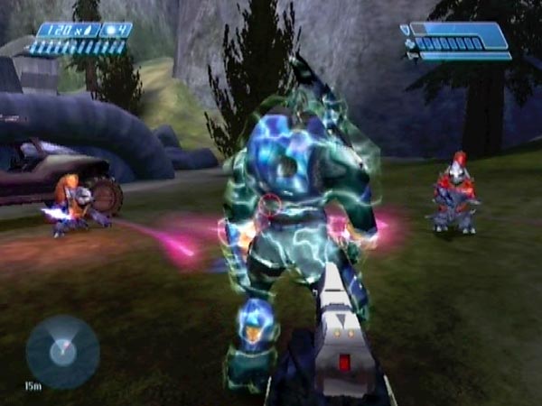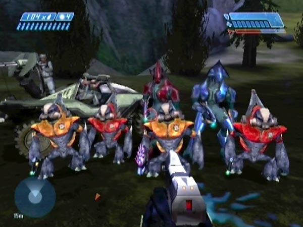 The covies' inactivity gives you a novel chance to get up close for a good look, and to play around with shooting them or launching them or whatever. The Grunts are pretty cute, looking around and occasionally jumping up and down as if to keep the circulation going in those little legs. Inactive covies also make very convenient subjects for testing resilience against various weaponry, if you're interested in Halo details.