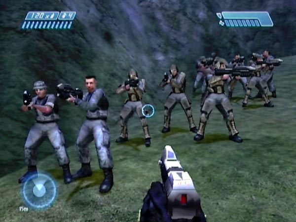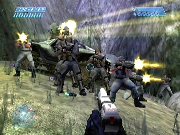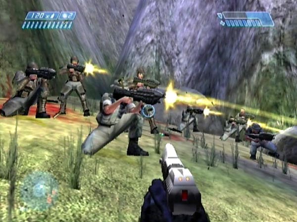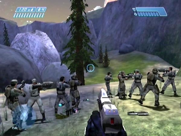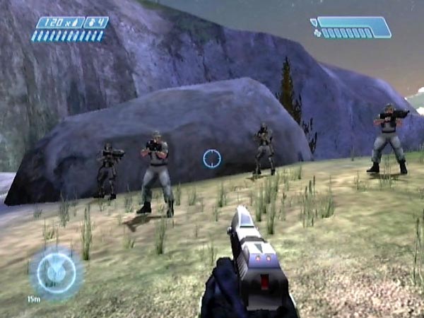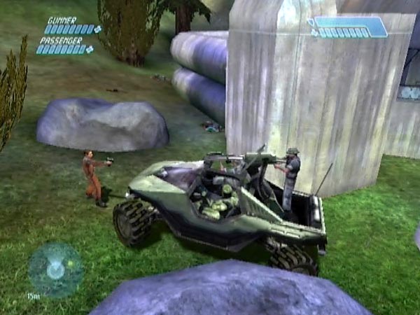 After that, place your hog to the right of the small structure, near where the Jackals were. Head into the structure. At the top of the ramp leading down, fire a few shots to attract a couple of Grunts into view, and kill them. With your path clear, run down and quickly kill the Jackals beyond the survivors (maybe use a frag grenade or two; you can replenish those back at the lifeboat in the valley). Lead the survivors back the way you came.
