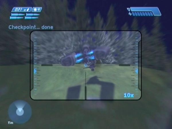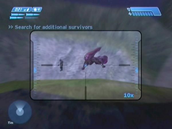 The next checkpoint will be for dropship 4, which will complete your set-up. In preparation for that, arrange things how you like, ready to kill the Marine (the final cliffside survivor) and thus trigger the Banshees. You can be anywhere on the hill, but if you want to avoid being immediately spotted, be near the right-hand end. For maximum convenience I suggest having the Marine dismounted and your sniper rifle zoomed in on him in the direction of the spawning zone, like in the demo.