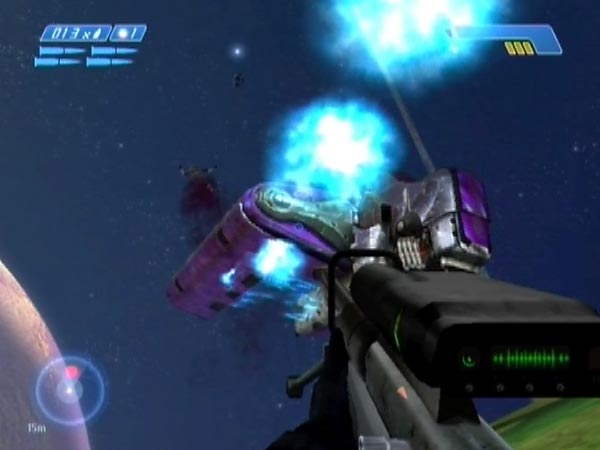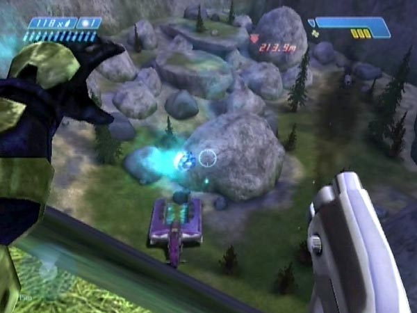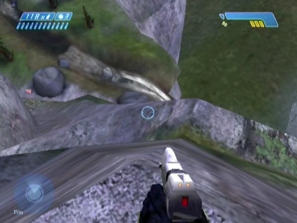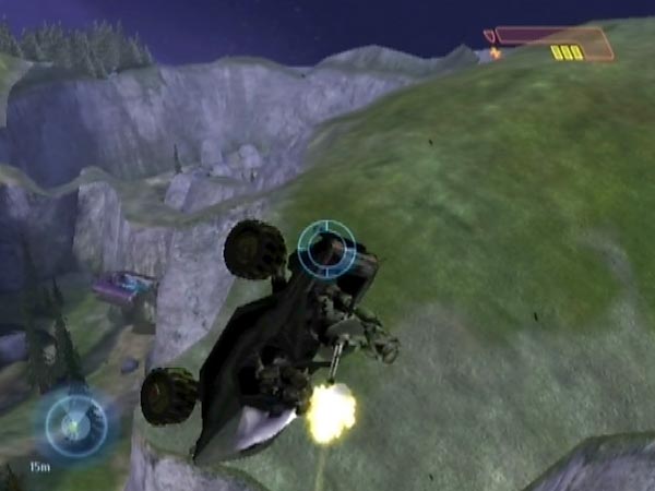 In BCM384 you can see plenty of all this with the final rockslide dropship (after I'd delayed ship 3's checkpoint suitably). On the right hand side of the ship there are four Jackals, which make the easiest targets. On the other side you've got one more Jackal plus an Elite. Those guys are harder to target because of the inconvenient angle you'll have, stationed down the hill. However, the targeting is actually still not terribly hard, despite how difficult it looks. You'll need quite precise timing though, for your shot or throw.