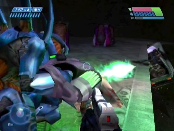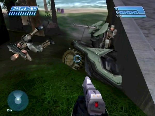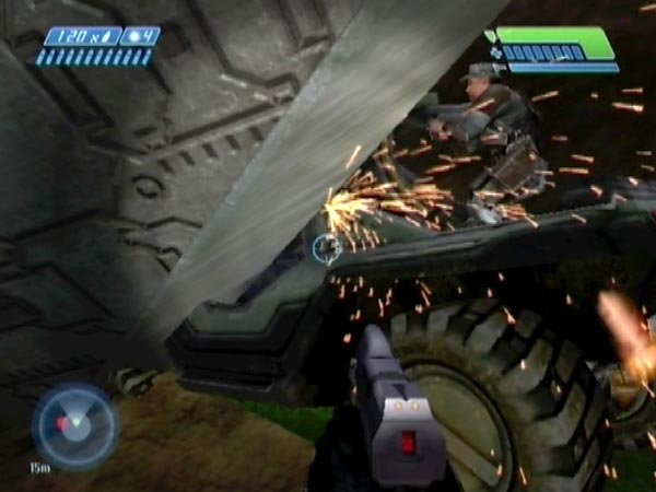Something else you can have some fun with is Hunters, who'll be present if you've been to the substation to open the main facility's inner door (you'll be able to get a rocket launcher after that). The nearest Hunter tends to get preoccupied with Marines in the stuck hog, enabling you to go up close to him without being attacked - although his distant buddy may send shots your way. You may even be able to stand on top of the Hunter.