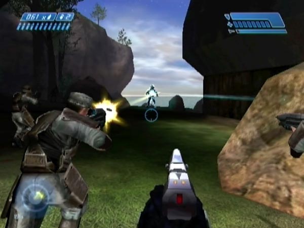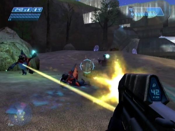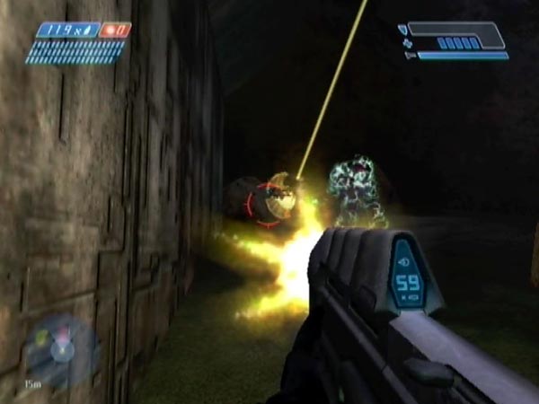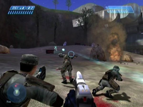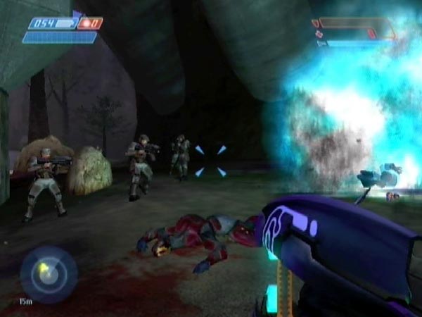 You're initially equipped with an assault rifle and pistol, plus frag grenades. A major hazard to the Marines are plasma grenades lobbed by the early Grunts, so you can help them a lot by whittling down the Grunts fast. The pistol is ideal for that, and all the better if you can pull off headshots. Frag grenades are another good option though.