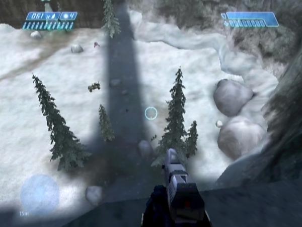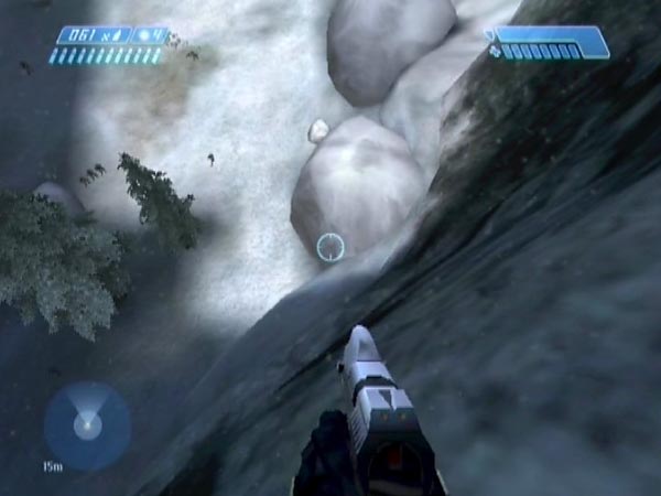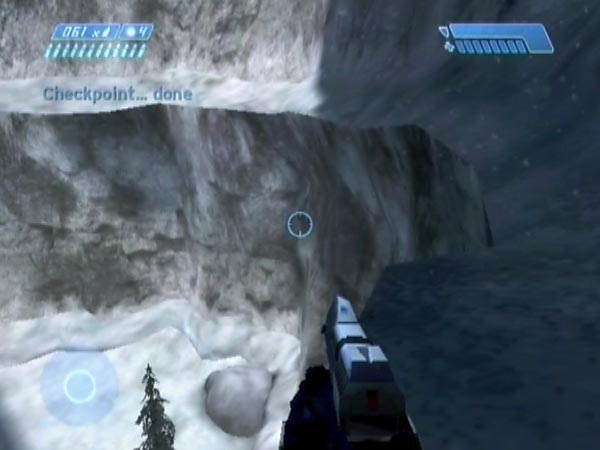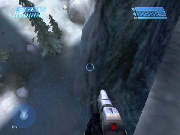 That was my usual way down for quite a while, but then I found another good route. Remember that dip I mentioned? Heading into that, fall off the downwards edge and let yourself be cushioned by the sloping cliff face and then the leftmost bulge of the snowy cliff base. There are nuances to this and you'll want some practice (it's not as foolproof as the earlier way), but as long as you get a good line, probably the worst you'll get is a bit of shield damage. There's a great bonus too. If you do a jump as you get to the snowy base, it gives you a kick-off which sends you shooting out across the snow quite a way. Good fun!