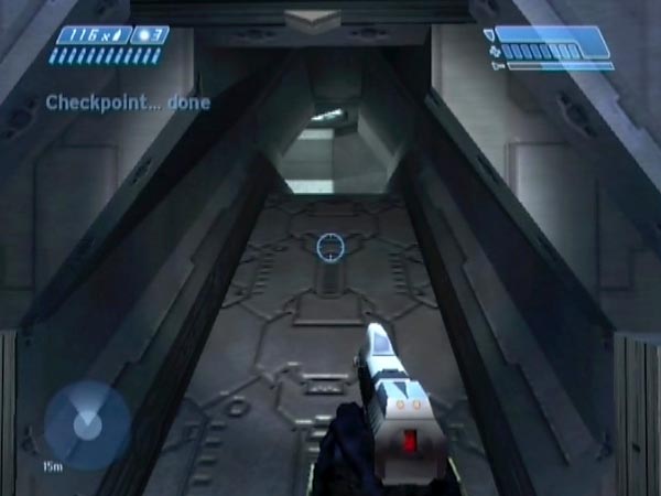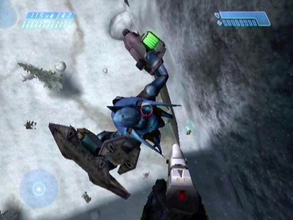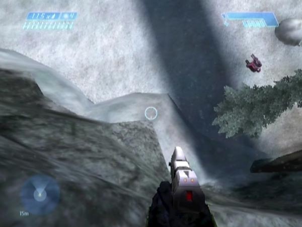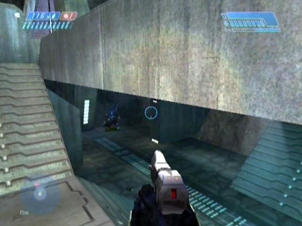Head back up and into the next room. After killing enough enemies to make things safe, lead a Hunter out onto the lower deck of the bridge. Near the far end where the Elite went off, dodge a swipe then quickly run off so he's left standing close to the edge (the closer the better), not pursuing.
