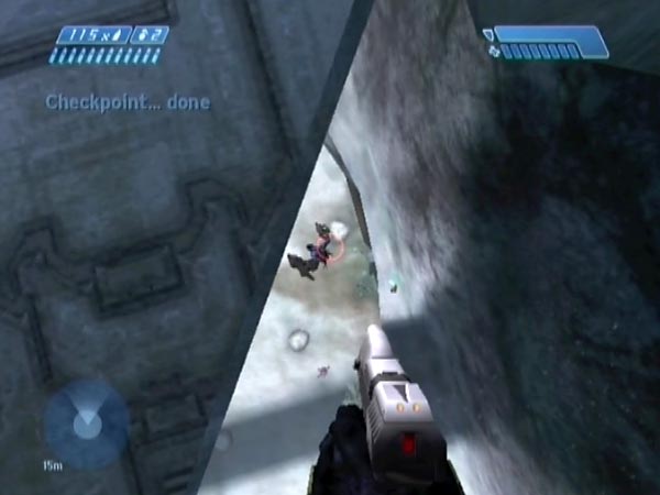 Go back up and into the exit passage. Cross the loading point, then quickly run back over the reverse loading point. When you crossed the first loading point, the Hunter started falling (because the bridge was no longer there to support him, I assume), and he continued on down until you crossed the second loading point, at which time he froze in mid-air and became your 'stepping-stone' to the Elite. You didn't want him to fall too far though, because you'll need to survive a fall onto him. That's why it was important to get back across that second loading point pretty fast. Obviously you can control his height by how fast you get back over.