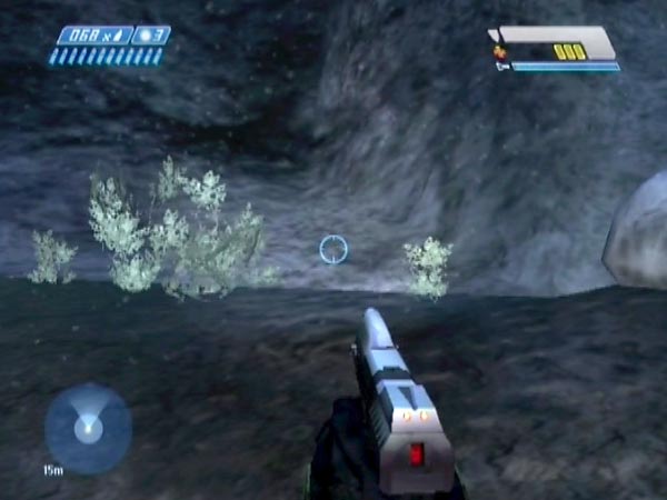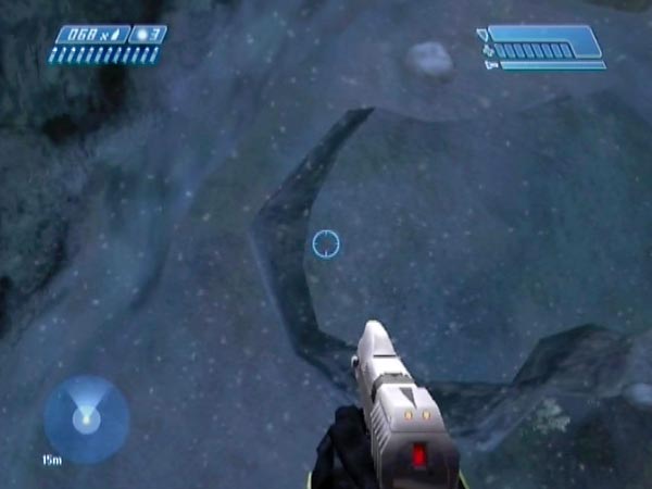 To make things as easy as possible for repeat attempts, get a delayed checkpoint when ready to fall from the V. The considerations for this are just the same as I mentioned for the plateau base rock method, namely that you might want to first eliminate the patrolling Elite and any Banshee (but especially the Banshee, as it's otherwise likely to attack and could easily cause health loss).