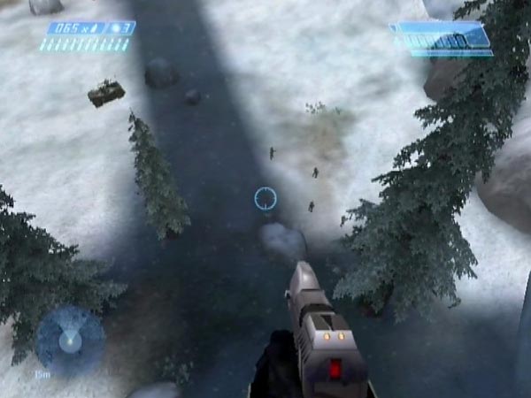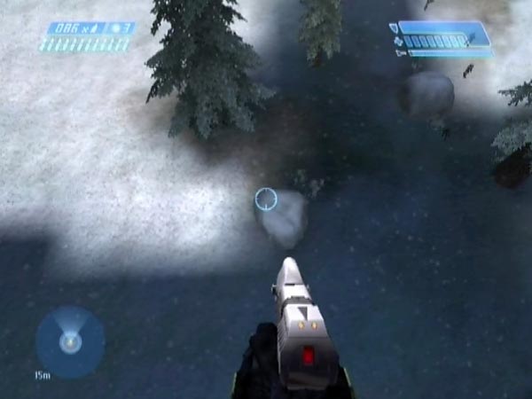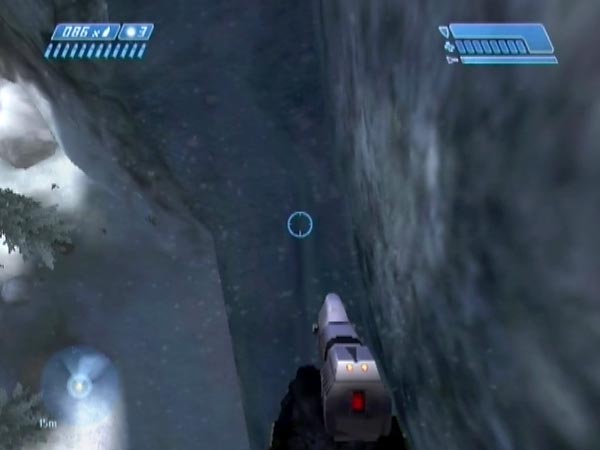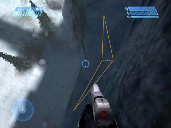 Get to the bottom of the V and face right. Run off the edge almost parallel to the cliff without much speed. Actually you can first move up the slope of the V a bit then just walk off, if you prefer. On the ledge below, there's a sort of chevron feature made from two abutting triangles resting against the cliff (see clarification pic showing the outline). They have a friendly slope and that's where you need to hit. You don't even need to crouch. Bounce off smoothly towards the rock on the near side of the Marine defence area. Crouch as you hit the rock on the side somewhere, and you can survive - potentially without even a flicker of your shield. Some rocks will be friendlier than others however (the rock will have been randomized last time you crossed a loading point).