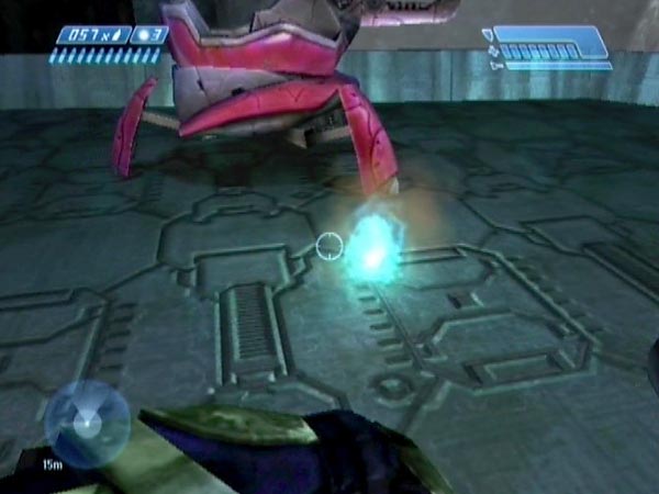 You can achieve the correct grenade placement as follows (or you could make up your own way, once you see where the grenade needs to end up). First you need to accurately position yourself. Facing the Shade from the side, lower your aim as far as it'll go (it'll be slightly ahead of your position), and get it as seen in the picture above, featuring a tile a few metres from the Shade. If you're slightly off - say by as much as half the width of a pistol reticle - that won't greatly affect your odds of success (I actually chose this particular aiming spot because it's roughly in the middle of a small patch of goodness), but try not to deviate much, because this whole thing relies on the Shade getting a fairly precise trajectory. For tips on making fine adjustments of position see my general article on precise self-positioning. Now aim at the middle of the diagonal line seen in the other picture, and throw a plasma. It'll bounce to the desired place.