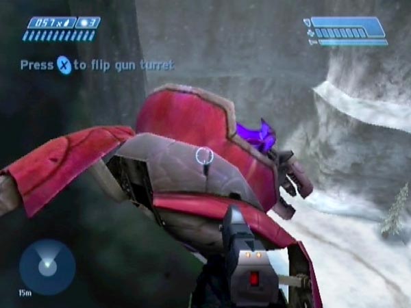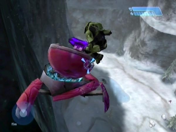 Throw a plasma grenade as seen in the first picture (or near enough), so the Shade will land on the V at the far end upside down with gun pointing away from the cliff (second pic), and start to topple off. Arrive there beforehand. You can safely let the Shade come in over your head - it's very predictable. Practically as soon as it lands, flip it. It should now be toppling off forwards with the rear leg dragging on the V. But if it's not quite going off, help it with a whack.