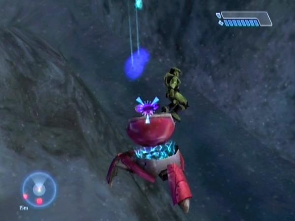 In regard to the primary version in which you bounce off the ledge, I think the publishing credit goes to Spotcheck. He descended that way at 0:58 in his AotCR Speedrun video on PC which I've been told was from April 2005, though I'm not sure where it was advertised. There's also a May 2005 High Impact Halo thread in which Spotcheck gives a mention and brief description of the method (for PAL Xbox I believe, not PC). Separately, 3rd Person had performed the same method during the Going Nowhere Fast contest, though he didn't capture it. More recently however, he demonstrated it in his YouTube video AotCR 2nd Fastest Bridge Descent. What you see there is actually pretty similar to the far landing routine I mentioned earlier, except he's using a fast-acting frag instead of a plasma. They're always in such a hurry these speedrunners!