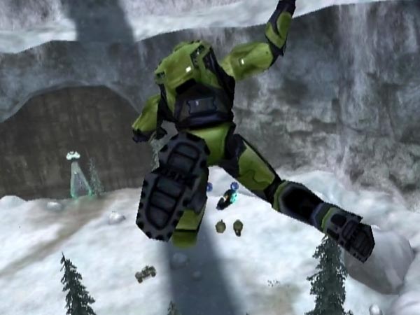 Get to the bottom of the V and face right. Throw a plasma grenade onto the ledge below (I'll say more on that shortly), pause for a moment, then run up the V a short way and head off almost parallel to the cliff, falling to arrive at the ledge just as the grenade is going off. If you timed things just right, the blast is non-fatal and it slows you up a bit, enough to now direct yourself to where you can be cushioned below as you skim off the ledge.