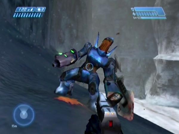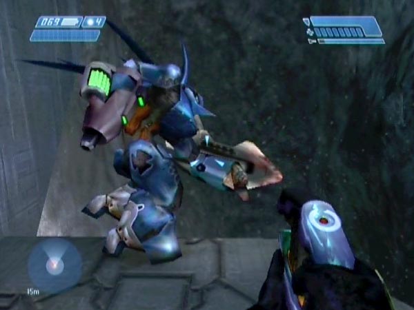In terms of difficulty this method is on a par with the similar patrolling Elite stop method, though it obviously takes more time. In both cases it's pretty easy to dodge the swipe at the edge of the deck (a bit harder with the Hunter), and you have a decent level of control in getting the enemy to go off the bridge at the correct angle to hit the ledge in the right area. Guiding the departure angle is probably a bit easier with a Hunter, because of how you can lead him up to the edge right behind you. On the downside, you can only take advantage of one checkpoint to help you. That would be best used for making attempts at getting him onto the ledge, which is certainly the hardest bit. The fall from the V is fairly easy.