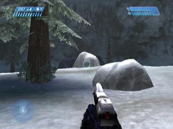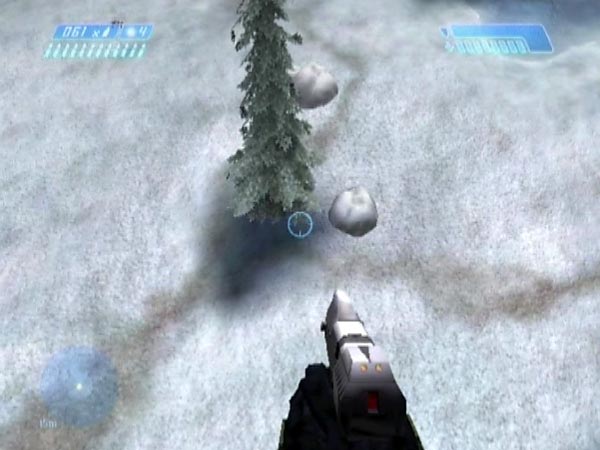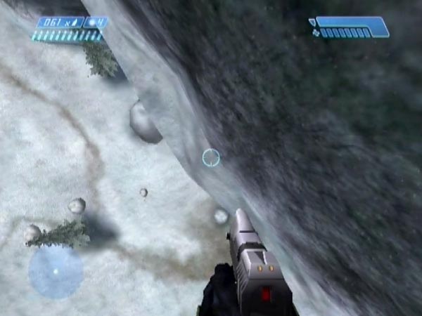 I guess Juggertrout was one such, because the trick appeared in his June 17th 2005 video Things to do on the first AotCR bridge when you're bored, as one of two "new" descent methods. Juggertrout tells me that he'd read about it in a forum, and decided to film it. The video was advertised in the High Impact Halo forum and can now be found in his video archive there. He performs the trick around 1:59, though with some interesting variation in technique compared to mine. He leaves the bridge heading further right but drifts left and ends up hitting the ledge at about the same spot that I would. However, at this point he's actually facing along the cliff and thus bounces off sideways. He's also looking down, with reticle very close to the ledge impact spot. At the moment of impact he switches to his other weapon then back again, which mystified me. But later I came across someone suggesting that switching weapons while looking down reduces fall damage - which is news to me if true! - so I'm guessing that was the rationale.