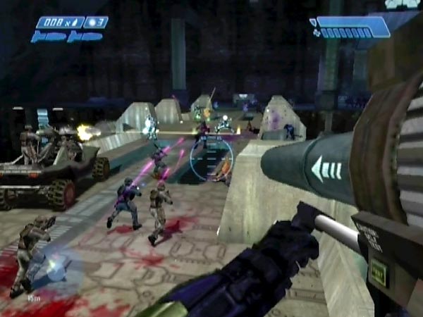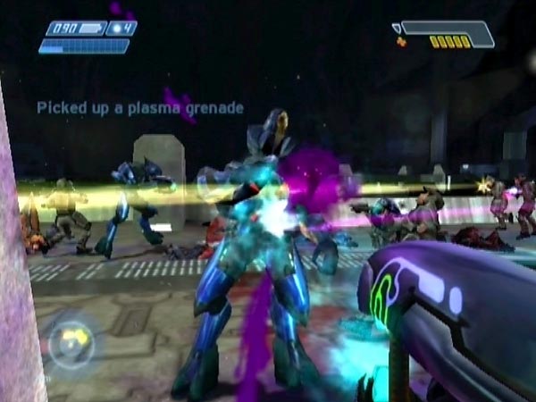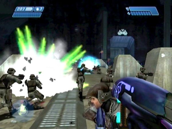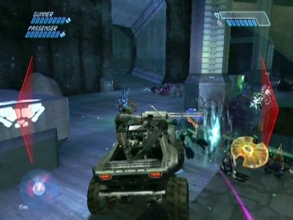 The Hunters are the biggest threat really. You can be doing a fine job of slaughtering the Elites and whatnot as you move up the bridge, and then BLAM! - a fuel rod shot sails in from the side and sends you into next Tuesday. You can reduce the risk a lot by keeping on the move but you'll still be living dangerously, especially in view of all the dropped grenades which quickly litter the ground, and which can cause your squad to be decimated if set off. You may want a rocket launcher so you can give as good as you get.