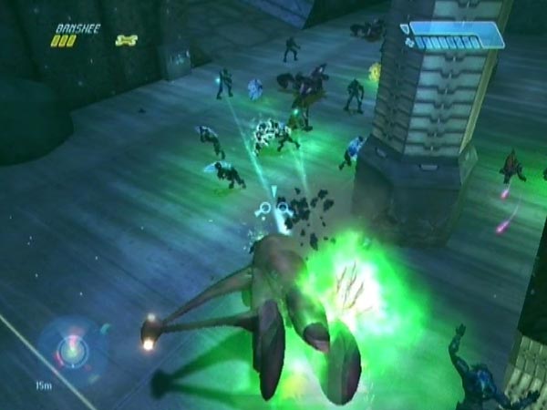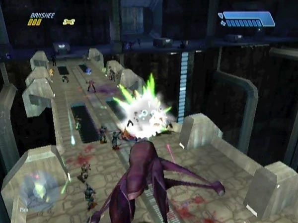 As well as using the Banshee's weaponry, don't forget that you can also mow down enemies or make them dive. You can potentially make some dive off the bridge into the chasm. If I can offer one other tip, it's this. When Hunters are present, beware of hovering in one spot for long, because even on Normal they're rather excellent at targeting you. In fact, many times I've been blasted even when swooping around! You can see a few such events in BCM143. On Normal a healthy Banshee can survive a direct hit, but you'd be in pretty bad shape thereafter.