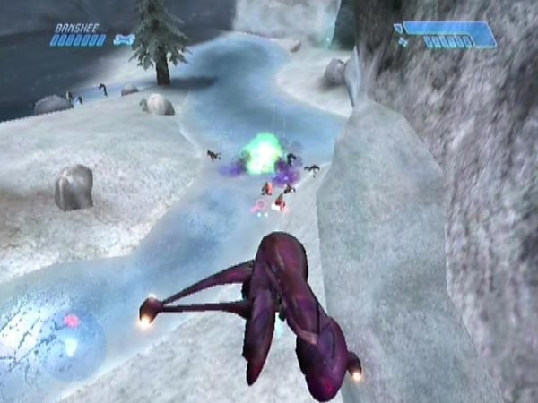 Another method is to fly high enough to avoid triggering the battle yet, go around the corner a short way - still a few metres back from the big tree - and let the Banshee sink vertically down. When you get low enough, the covies materialize (if you weren't too far forward) and you can send a blast into their midst before they even know what day it is. You can even fire your shot before they spawn, if you care to anticipate their appearance.