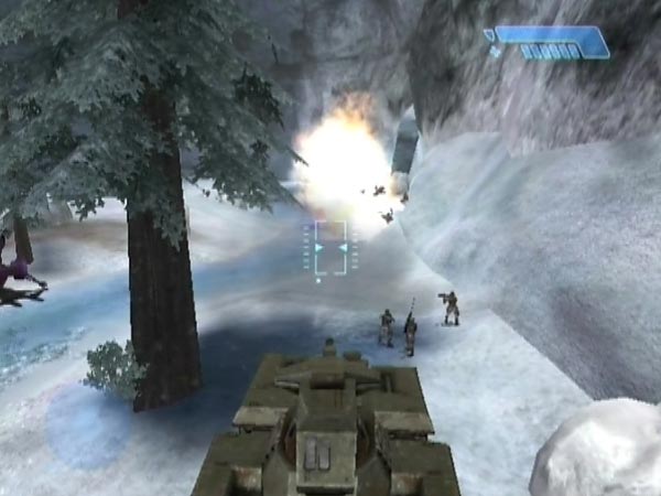 Fly over the step high enough to avoid triggering the battle yet, then land and board the tank. Move it onto the stretch of snow on which the Marines will spawn, have it aimed at where the covie mob will appear, then back it up past the tree. When you get back far enough, covies appear and BOOM! - a single well-placed blast can take out the whole lot, leaving just a few off to the left further away. The Marines will quickly board, and at that point it's worth making sure Johnson has a clear line of fire with his sniper rifle. Finishing off shouldn't be much trouble.