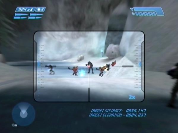 You can also tackle things on foot after flying over the step high enough to avoid triggering the battle yet. Back up like I indicated with the tank, ready to slaughter the main mob when they appear. The weapons of choice for this are the sniper rifle, rocket launcher and pistol. I favour starting with the rifle, poised to bring down the Elite with 2x zoom. But an extra tactic you can use is to throw a grenade in advance, triggering the covies just as it's about to go off. That should help things along rather nicely.