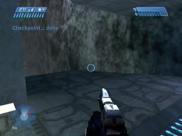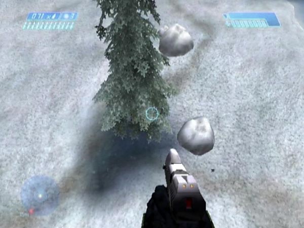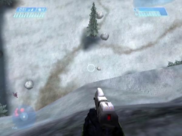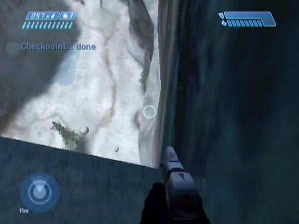 Believe it or not, it's possible to fall to the ground from the first bridge and survive, as long as your fall gets cushioned appropriately on the way. It's a trick that opened the door to a huge amount of new fun for me, leading to a lot of new site material. I'm not sure of its origin, but thanks to One One Seven for mentioning the general idea to me in October 2004. Sadly though, the trick is only suitable for the PAL version of Halo. It involves a long fall to a ledge, and with NTSC or PC you'll probably find yourself dying before reaching it (see here for some discussion, and here for cocopjojo's demonstration of failure on the PC). There are other methods of descending however, and for most purposes they'd do just as well if they work for you.