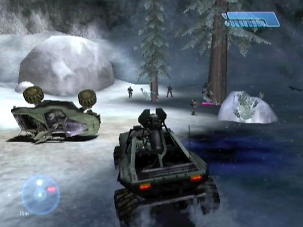 You can get an extra Warthog near the start of the level. Do a descent trick off the first bridge and back the hog into the indoor passage, all the way down the long middle section. Dismount and go up in the lift after bringing it down - be careful not to waltz into the empty lift shaft! Go through the room and into the passage beyond, far enough to trigger enemies in the room. You can go far enough to get a checkpoint too if you like, but it's not necessary. Now resume normal play, coming back down. When you get back to the hog, mount up and drive into battle. You'll find that the game has created a new hog outside, placed in the usual overturned position.