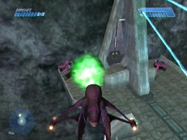 While doing the killing, be careful that you don't cause the mob below to start attacking the Marines. If you stay in a suitable area on the left side of the bridge the covies safely collect near the Shade plateau (see pic), something you can see in BCM356. However, overturn any Ghosts there first, or Elites could hop aboard and cause trouble. You can always blast them back upright later if you want. Note: when the patrolling Elite is on the lower deck he can be difficult to target, but an alternative is to briefly fly under the deck in Shark style, to make him dive off.