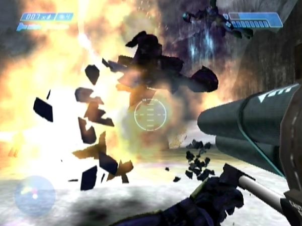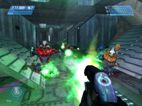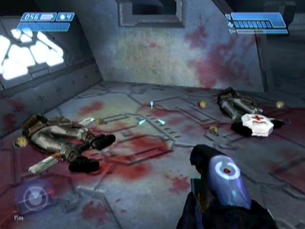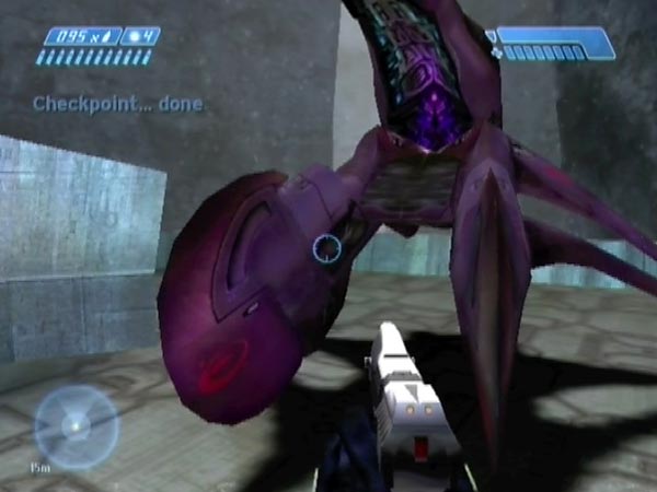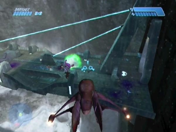 When it comes to triggering the battle, work as follows. Land at the far end of the bridge, go inside and trigger the second room (unless you've already triggered it, that is). Return, fly down and dismount near the door. Go through, triggering the battle, and continue inside to the lift. Bring it down and ride up, causing normal checkpoint structure to be resumed, then come back down (causing the removal of the Marines outside) and kill the covies which have now spawned in the room (without losing health of course).