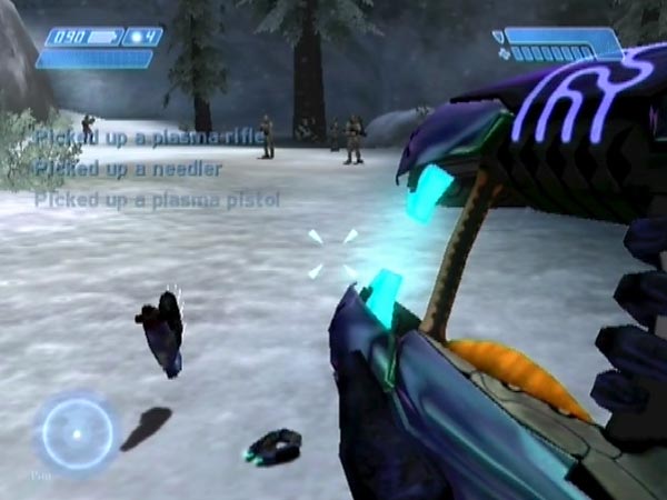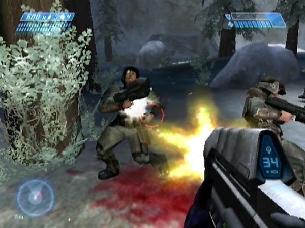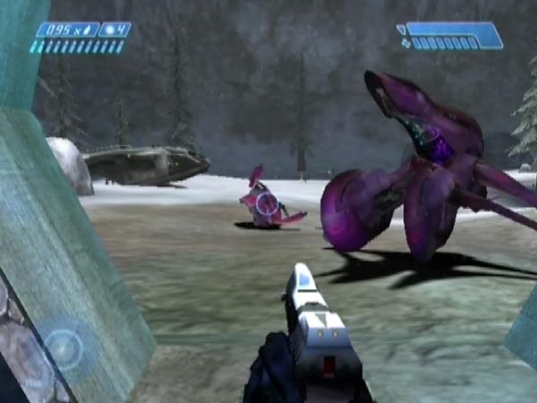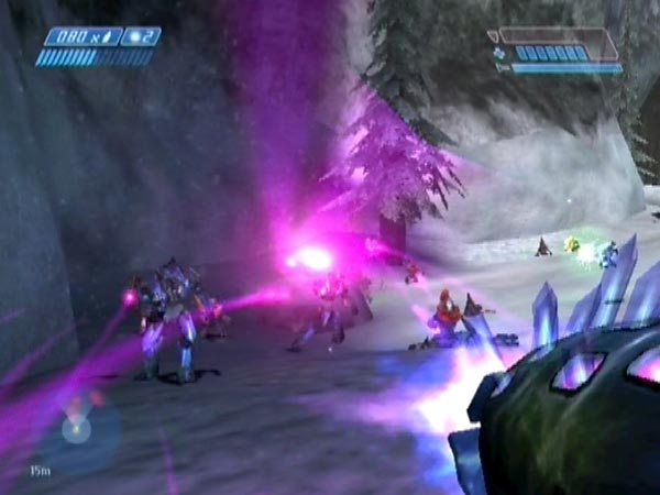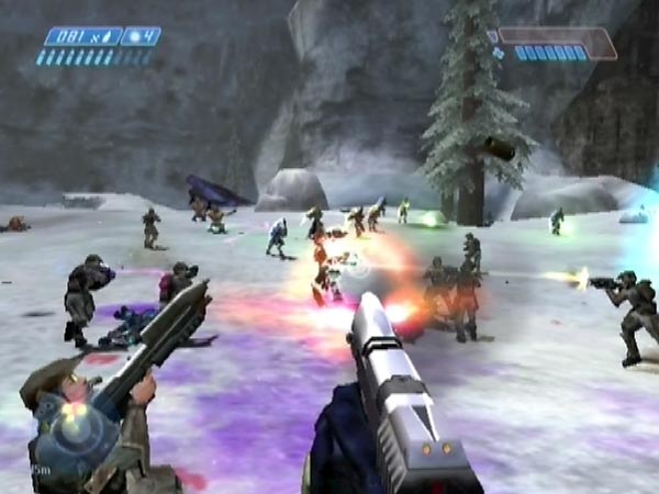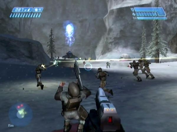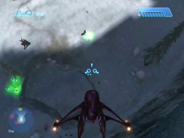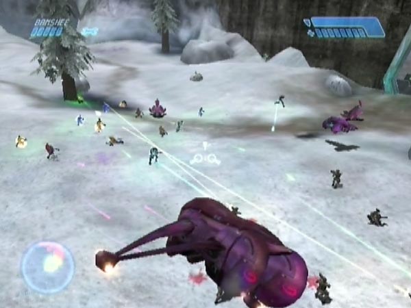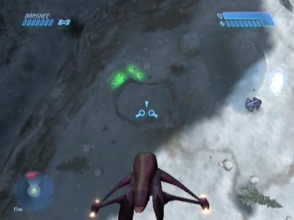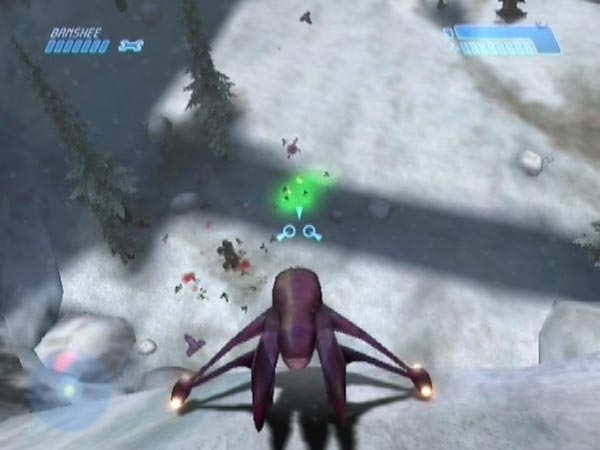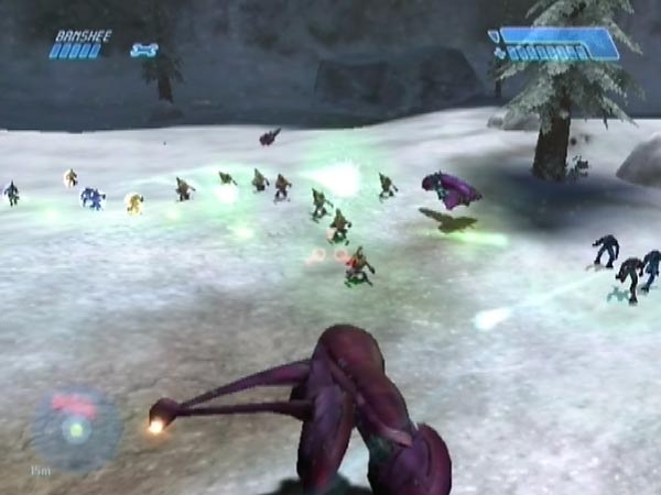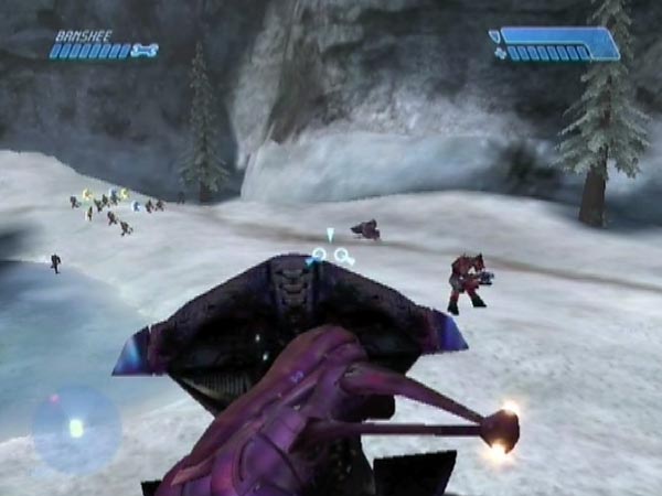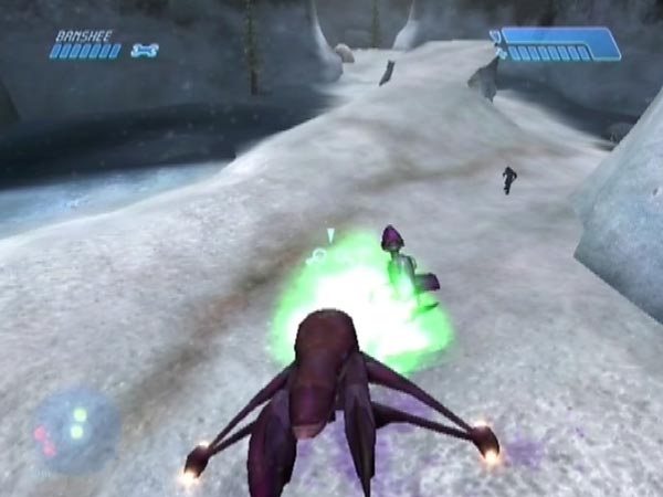 Lead the mob to some starting point, fly to your Marines to link up with them, then start roaming around the battlefield. Your Marines follow and the enemy closes in. Keep on the move, perhaps circling around. Pretty soon the Covenant and Marines should be all mixed up in a big trigger-happy stew. A fine recipe for chaos. Circling the enemy in a Ghost is great fun as you can continually strafe the enemy caught within, creating a scene of utter devastation. Circling in a manned Warthog is pretty good fun too.