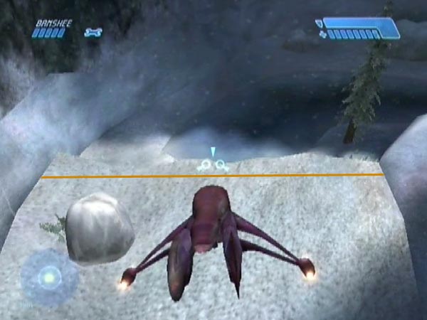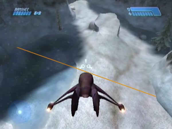 Reboard the Banshee and quickly head up the battlefield relatively low down (below treetop height or thereabouts), to cross the upfield trigger line that goes across the field around halfway past the ice patch (see pic). Among its effects, the trigger gives most of the covies new behaviour, namely to chase you. As such, the ones attacking the Marines will start backing off to come after you instead. Hopefully everyone survives that brief clash (this is why you want to trigger the retreat fast), but you can check later. This chasing behaviour is the crucial thing that makes this whole mob battle business work.