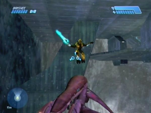 In all cases, ideally you want a handy delayed checkpoint for making tries at getting him down. With the gold Elite you can use the bridge checkpoint triggered along with the Elite. Otherwise you can use a tunnel checkpoint. For a Hunter or non-gold Elite, you need to dodge a melee attack on the edge of the deck (see here for the patrolling Elite). For the gold Elite there's an easier option, demonstrated in BCM360. Hover close in a Banshee, to tempt him into leaping off (see pic).