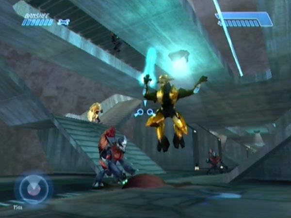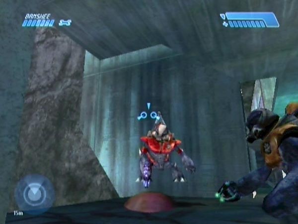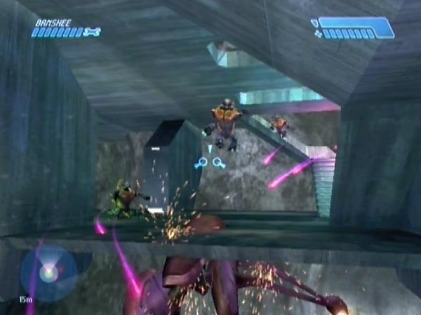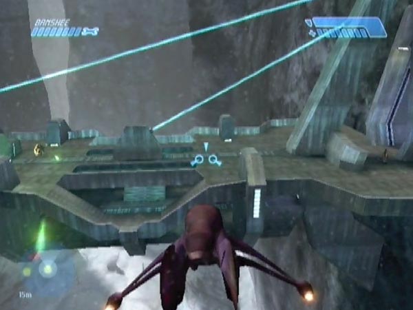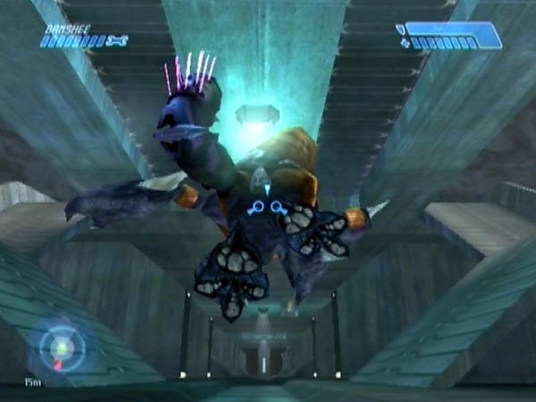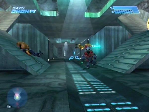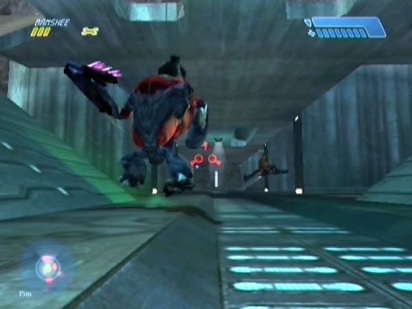 Park your Banshee by the door beneath the bridge. Go inside to the lift, bring it down and ride up, then go through the room and into the passage beyond, triggering enemies in the room you just came through. Turn around and resume normal play, heading back down.
