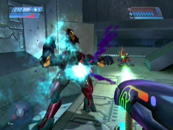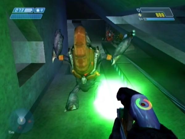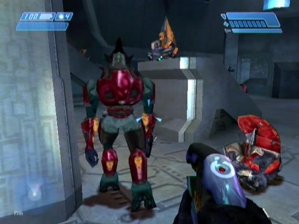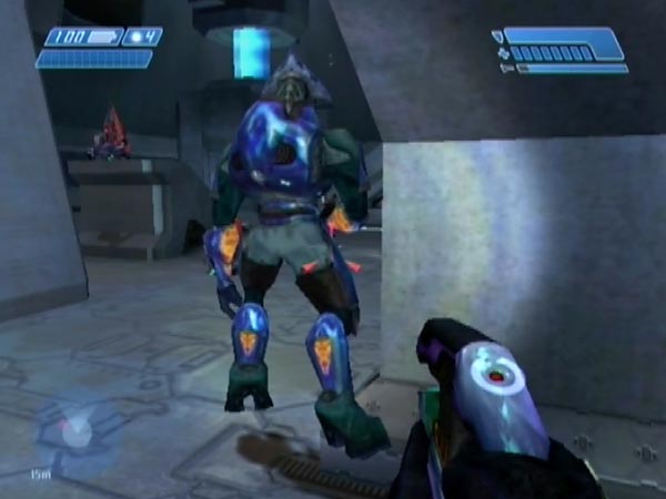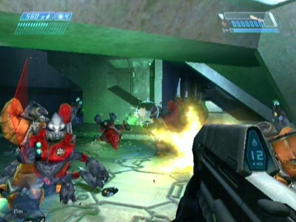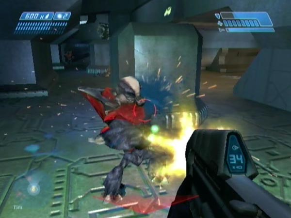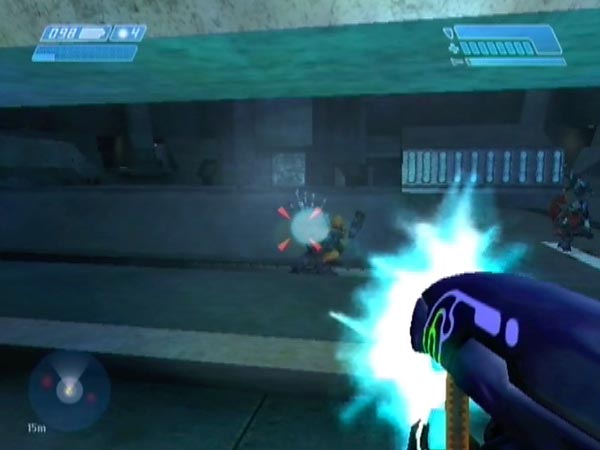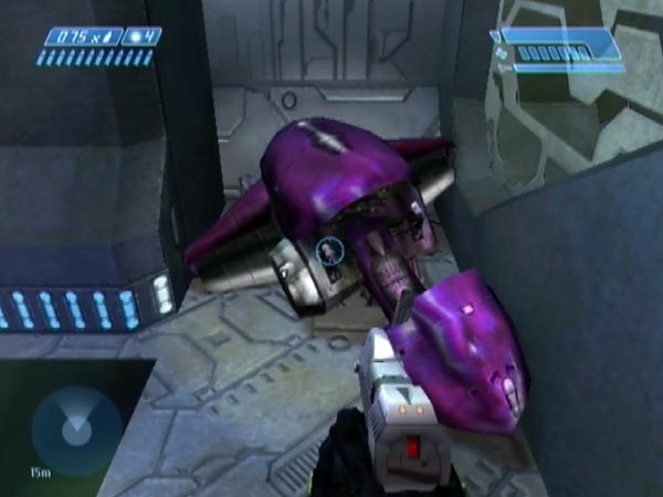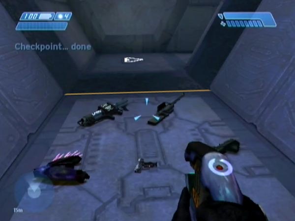 Mind you, there's a quirk. Quite often one of the Grunts spawns badly and falls through the scenery, into the void. He gives a cry such as "Not again!" (namely a tag cry, which is what Grunts use when they fall), and you see a tracker dot for him off to the right as you approach the door (the other two dots being for the Elites). In such a case then, you'll actually be one Grunt short of the number you were supposed to face. Not that you'll notice much difference in battle though, with so many of the critters around!