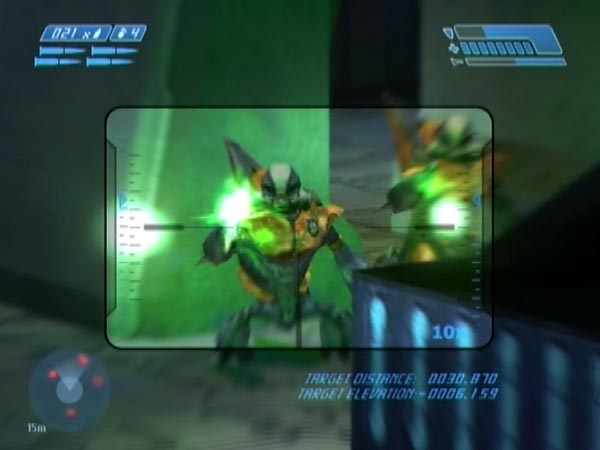 Around three sides of the inner area there are shelf-like strips you can easily get up onto to attack from. It's a form of inner play then, but one with its own special feel and possibilities. I'm thinking especially of the sniper rifle here but the rocket launcher is good too (you can see both used in BCM493), and then there's the pistol of course, good for picking off individual Grunts.