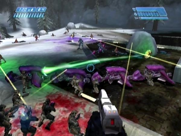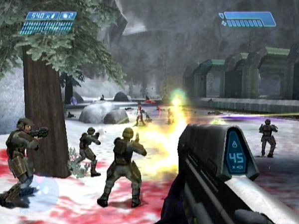 With a load of Marines taking up much of the enemy's attention, I don't always stay near the trees. It can be fun to position yourself well off to the side, at the end of the pipe block. From there you can fire into the sides of enemies attacking the Marines. Jackal sides will be unprotected as they carry shields on the right. You'll have to watch out for quite a bit of fire coming your way, but you can use the corner of the block as cover. You could even jump up onto the block and use a pipe for cover.