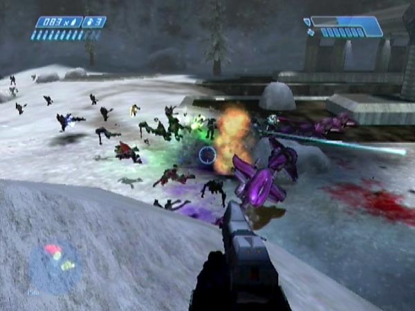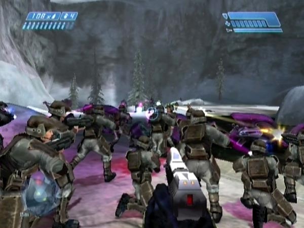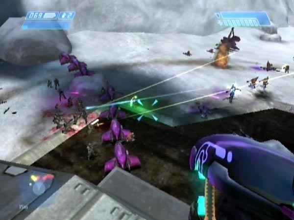 If you back off somewhat from that diagonal blockade or go up on the cliffside rock, the Marines get triggered into falling back. You might like to do this on purpose if you think they're taking too much punishment, or if you think the blockade is about to be breached by an incoming grenade (Grunts are a major threat with their plasmas). You could fall back to a secondary defence from a safer distance. Some other Marine behaviour is that if the blockade is breached (and they haven't fallen back), they'll tend to charge through the gap, at which point everything is chaos. Good fun!