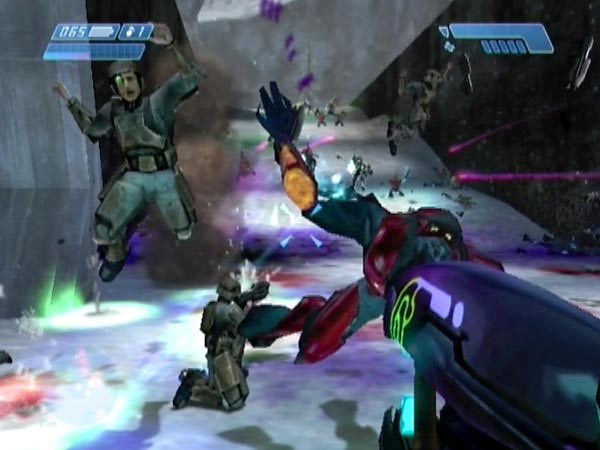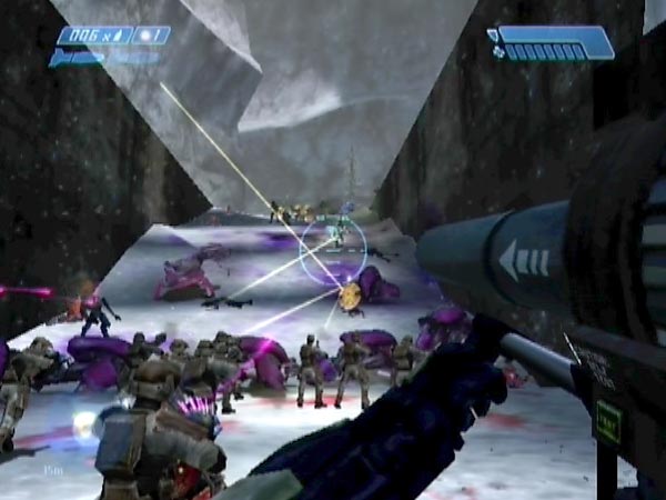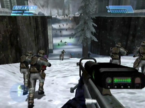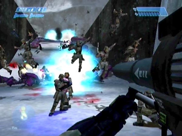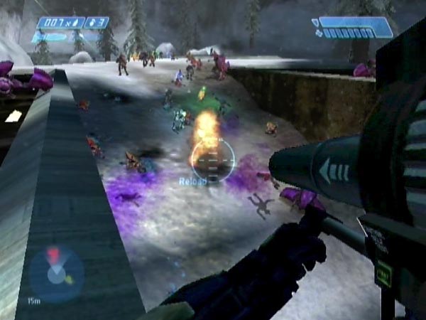 If you've got Marines, they tend to rush down into the trough to mix it with the enemy. Not a good idea guys! Still, it does give you the challenge of trying to keep the idiots alive. When the enemy start to get closer to you, a plasma rifle is probably the best weapon to have, perhaps coupled with a pistol. When Elites are charging up, a stream of plasma to the face is good for stopping them in their tracks. Only trouble is, there are probably another two or three big nasties just behind! Oh dear.