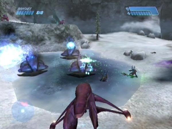 Fly back to the early Wraith then push it through the crashed Pelican area and down the sloping path on the left. Once it gets past the rocks on that path, it should head for the ice patch of its own accord. If you want a new Banshee afterwards, you could fly through the level and get one from the top of the tower. The Wraiths should still be present when you get back.
