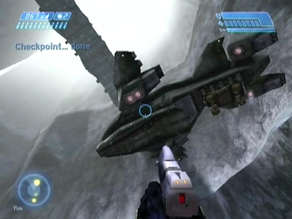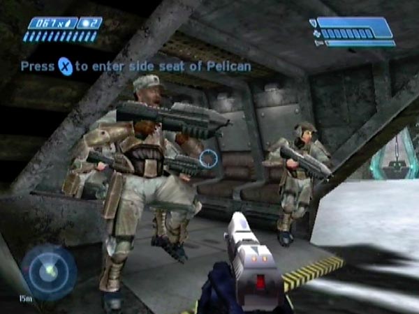 At the first bridge, Echo 419 flies in to drop off four Marines, including either Johnson or Stacker (randomly decided at or after the preceding loading point). If you use a descent method to get down off the bridge, you can easily be on the ground in time to greet their arrival. But also, when they dismount you can board the Pelican yourself to get taken for a nice ride! Just hit X to board - and to later bail at any time. You can sit on either side, getting a different view in each case.