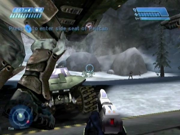 Towards the ice patch there are a couple of rocks you can stand on to get extra height, potentially allowing you to board with a normal jump as the Pelican passes close by. Incidentally, the geometry of those rocks is not fixed; it will have been randomized when you went through the last loading point.
