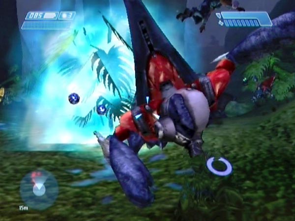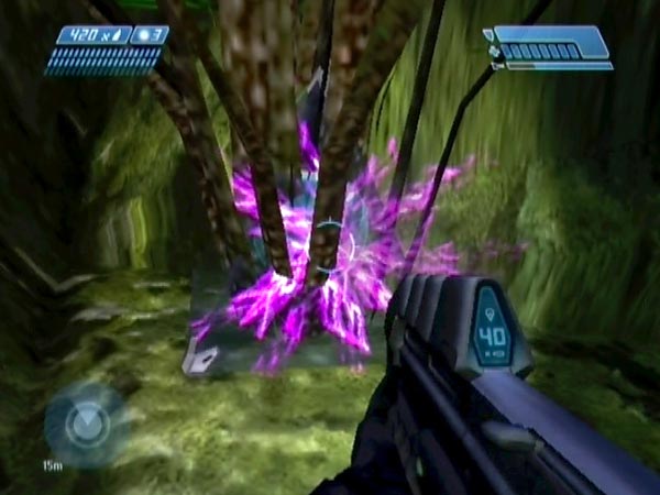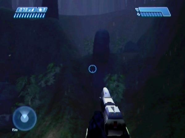 Apply the camouflage and you can use it in the next area, where Grunts and Jackals are under attack from some frankly non-existent enemies (you can quickly advance and see that there are no gurgling assailants anywhere!). You'll have enough cloaked time to simply run straight past the covies, or you could use it to give them a nasty surprise or take care of a good number of them by stealth. But remember to have your flashlight off or it'll give you away.