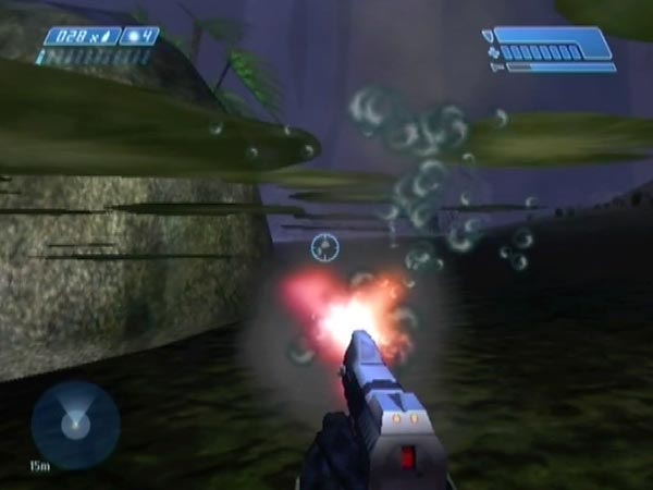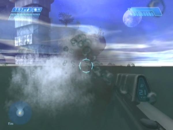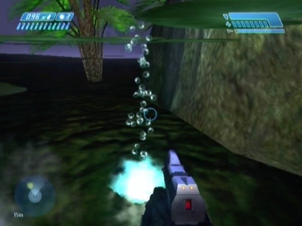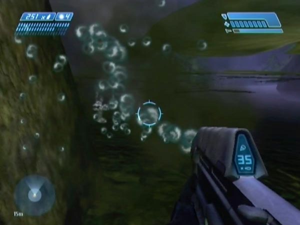 At the start of level 2 there's a pool where you can submerge, but sadly you can't get any bubbles. In fact the water programming there seems to be a bit lacking, as if Bungie ran out of time to fully flesh things out in regard to underwater aspects.