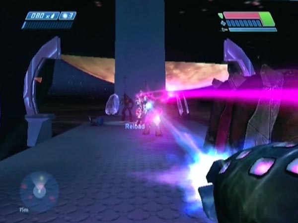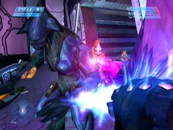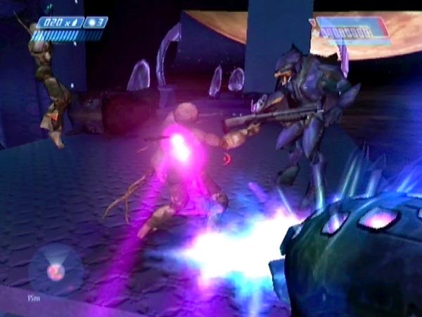 On the left of the platform as you face your attackers, there's a pair of purple boxes, ideal for hiding behind with a shotgun. Just as an Elite is coming along, let him have it point-blank. BLAM! It's also a good position from which to blast Flood as they jump down. On Heroic (or Legendary if you're fool enough), it's hard to survive without using cover, so these boxes come in mighty useful!
