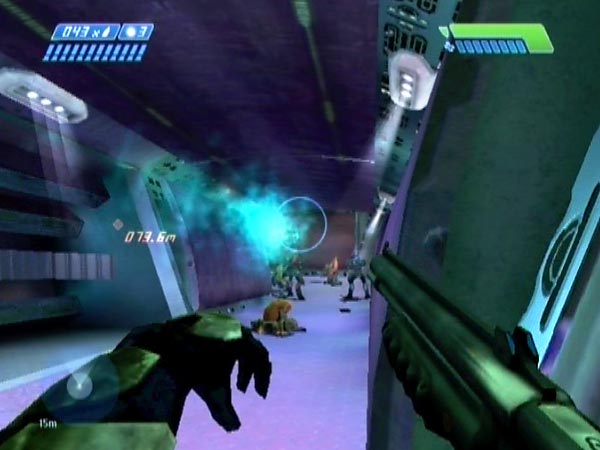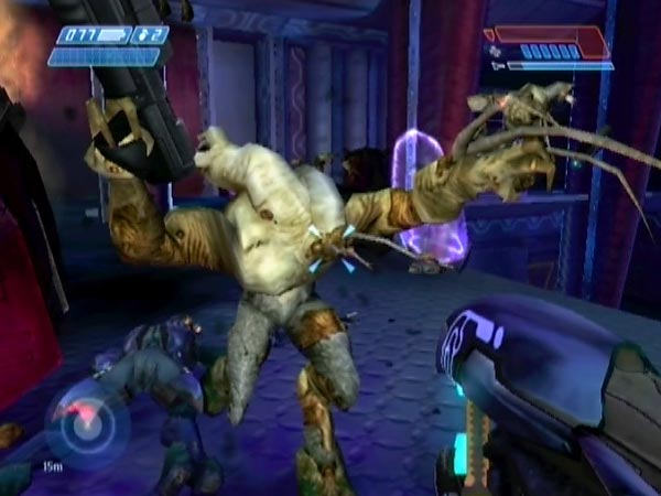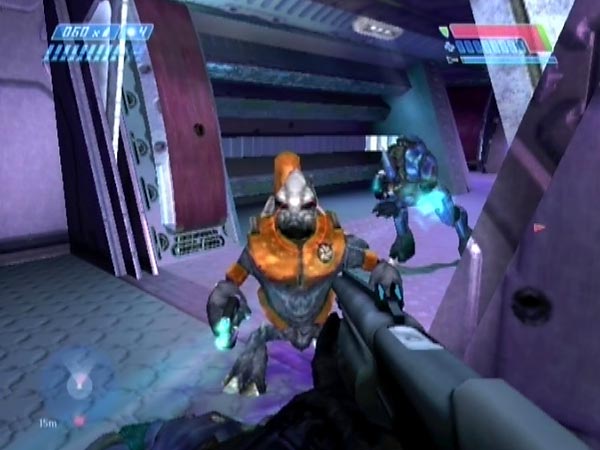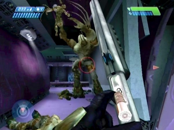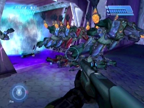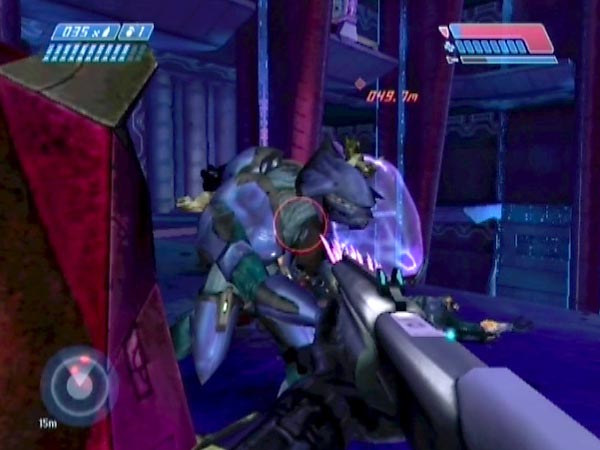 Eliminate the platform Elites and head in. Just before you reach the platform there's a recess in the wall on the left. Station yourself within, hidden from unsuspecting covie reinforcements. Watch for them on your tracker, and let 'em have it with a shotgun or whatever as they come into view. Actually I quite like letting Elites go past, then sending streams of needles into their backs as they head onto the platform. Of course, you'll also have Flood to deal with.